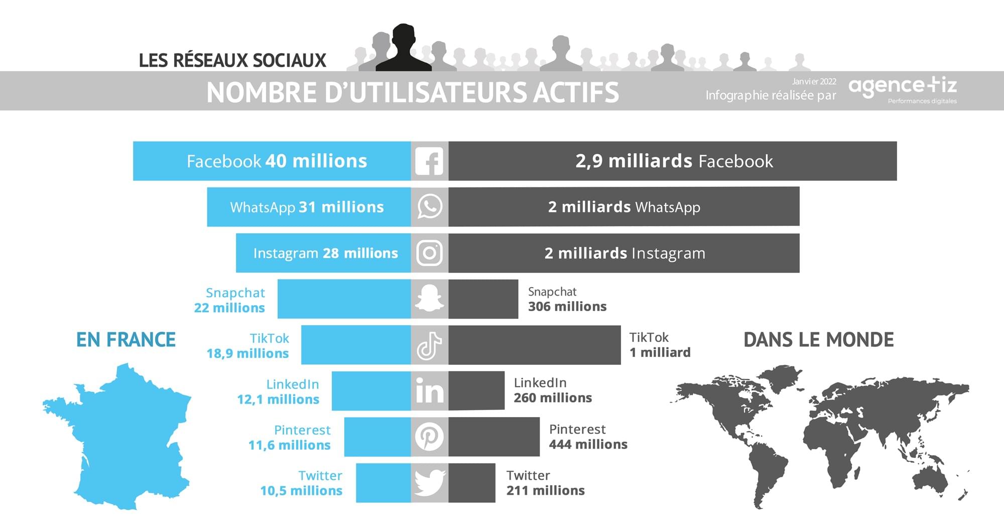 - Facebook Messenger, Whatsapp, Instagram et YouTube sont respectivement classés dans le top 5 des réseaux sociaux les plus utilisés par les internautes français de 16-64 ans. Snapchat, en 6ème position, devance TikTok, Twitter et Pinterest.